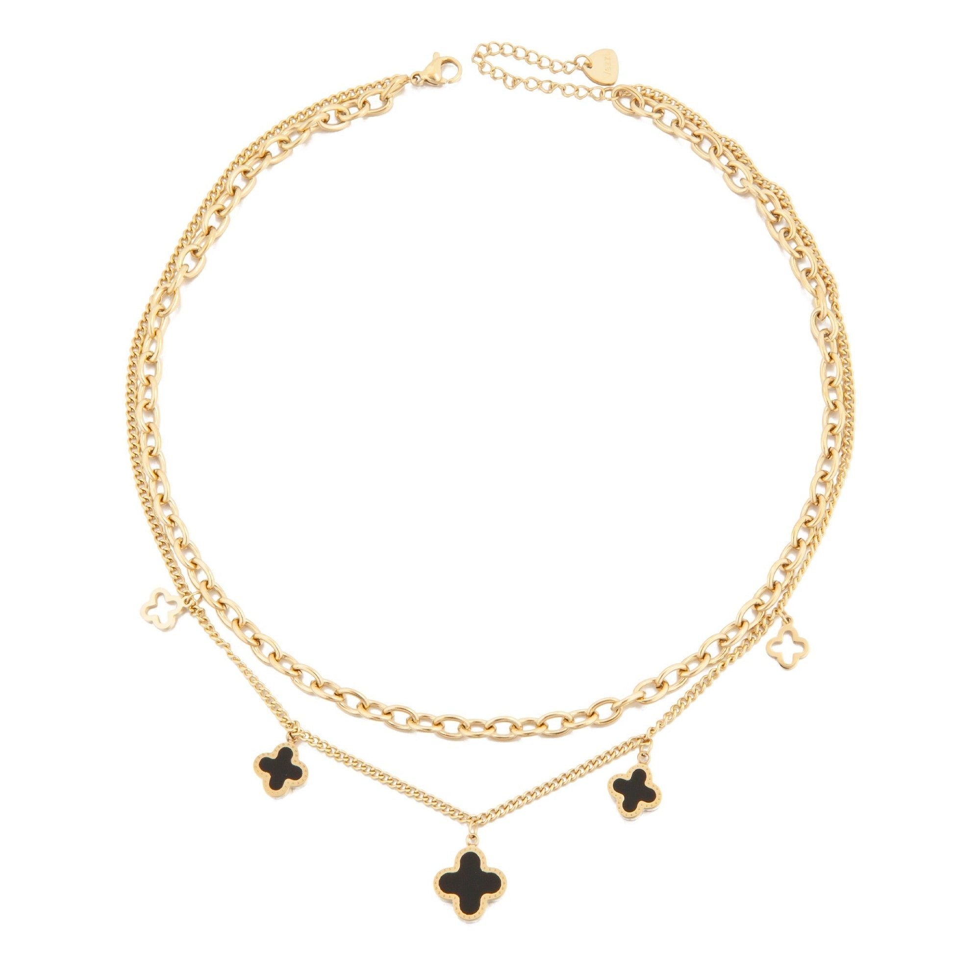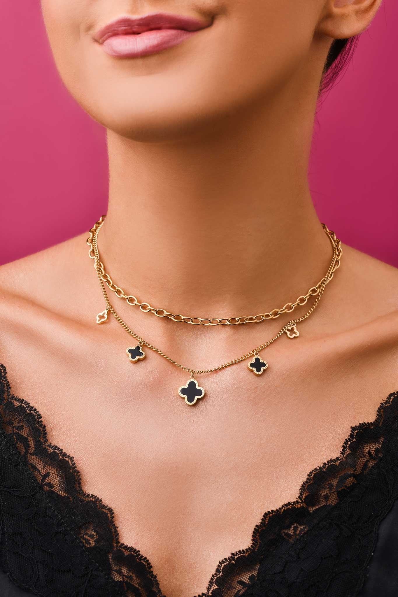 14k Gold Plated Double Chain & Two Side Clovers Necklace