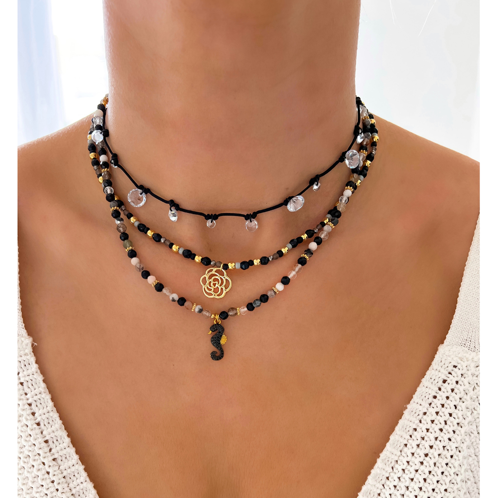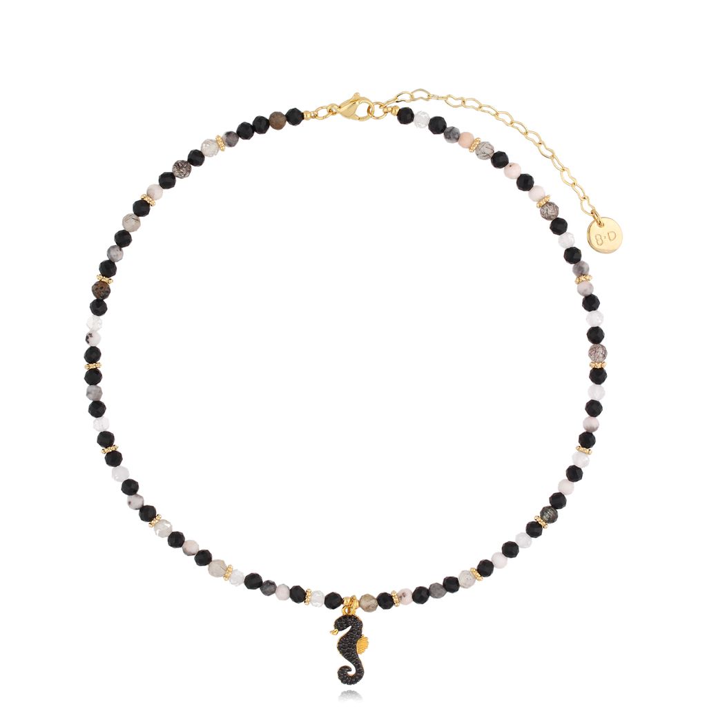 Black and Gray Natural Stones Necklace with Crystal Seahorse Pendant