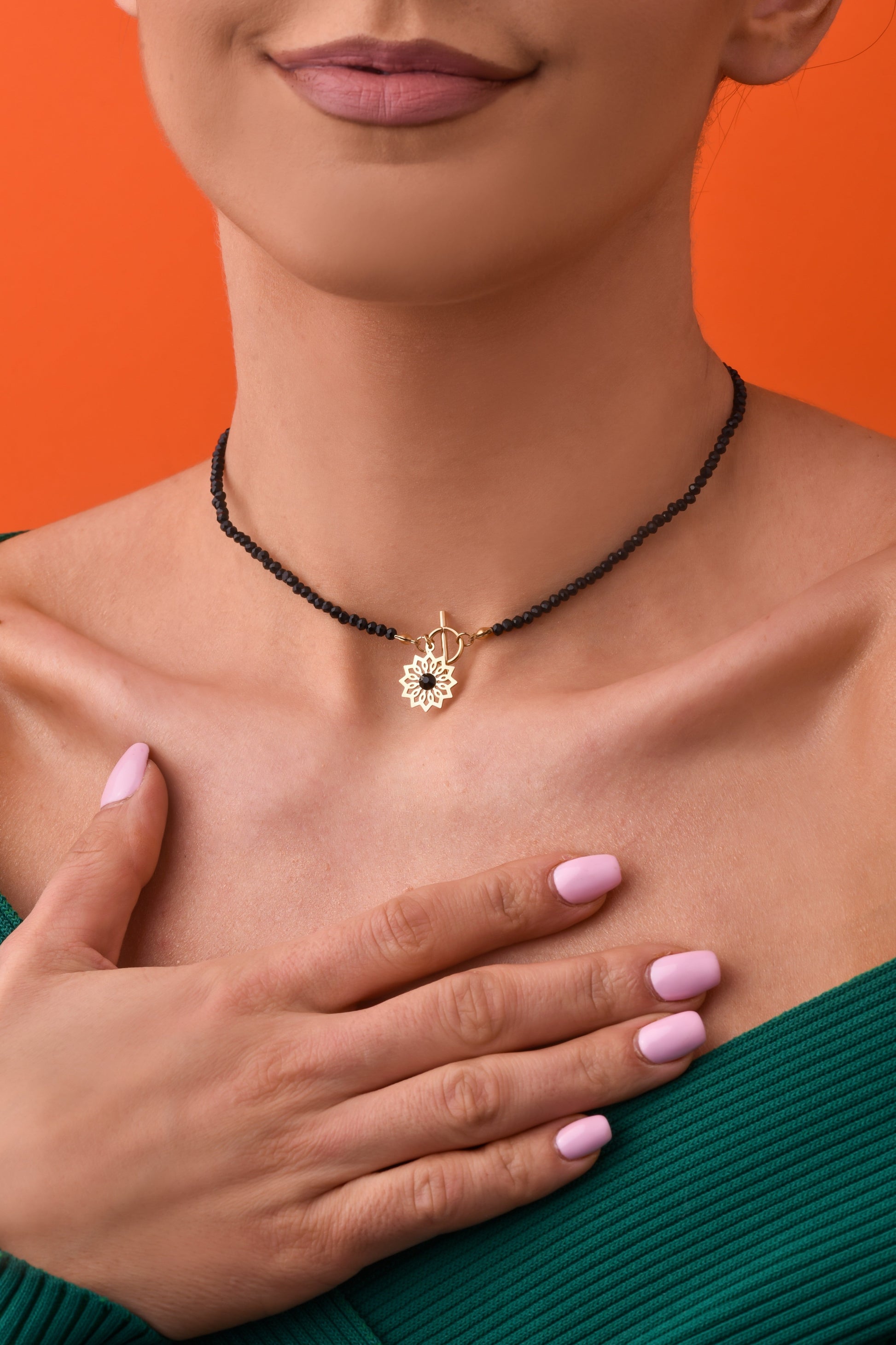 Black Crystals Choker Necklace with Flower Pendant