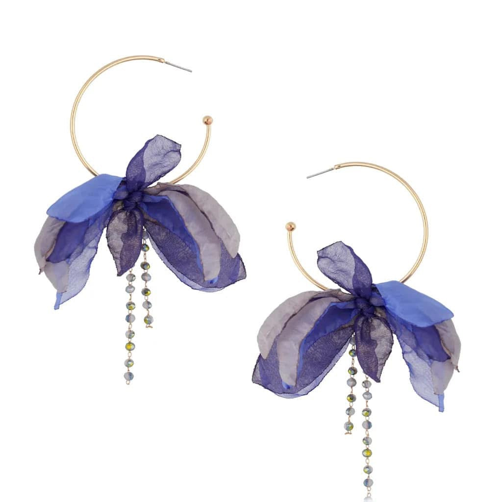 Dark Blue & Gray Silk Flower Hoops Earrings