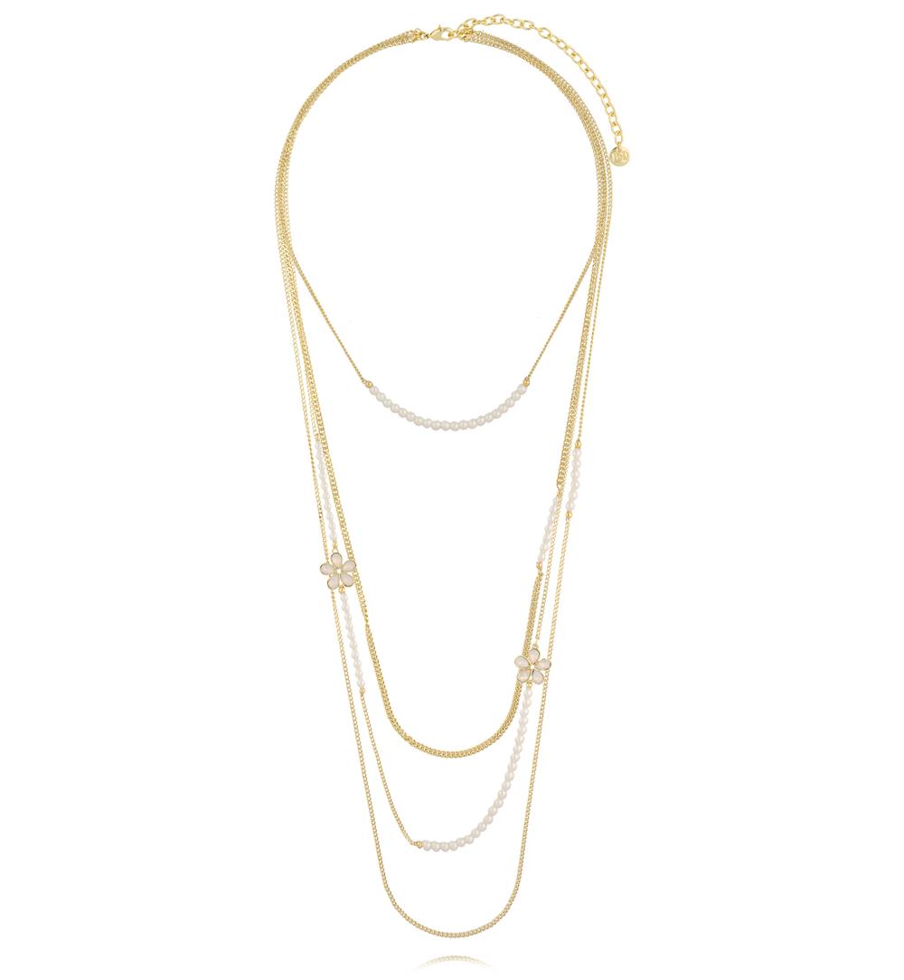 Multi Layers Necklace with Pearls and White Milk Crystal Flowers