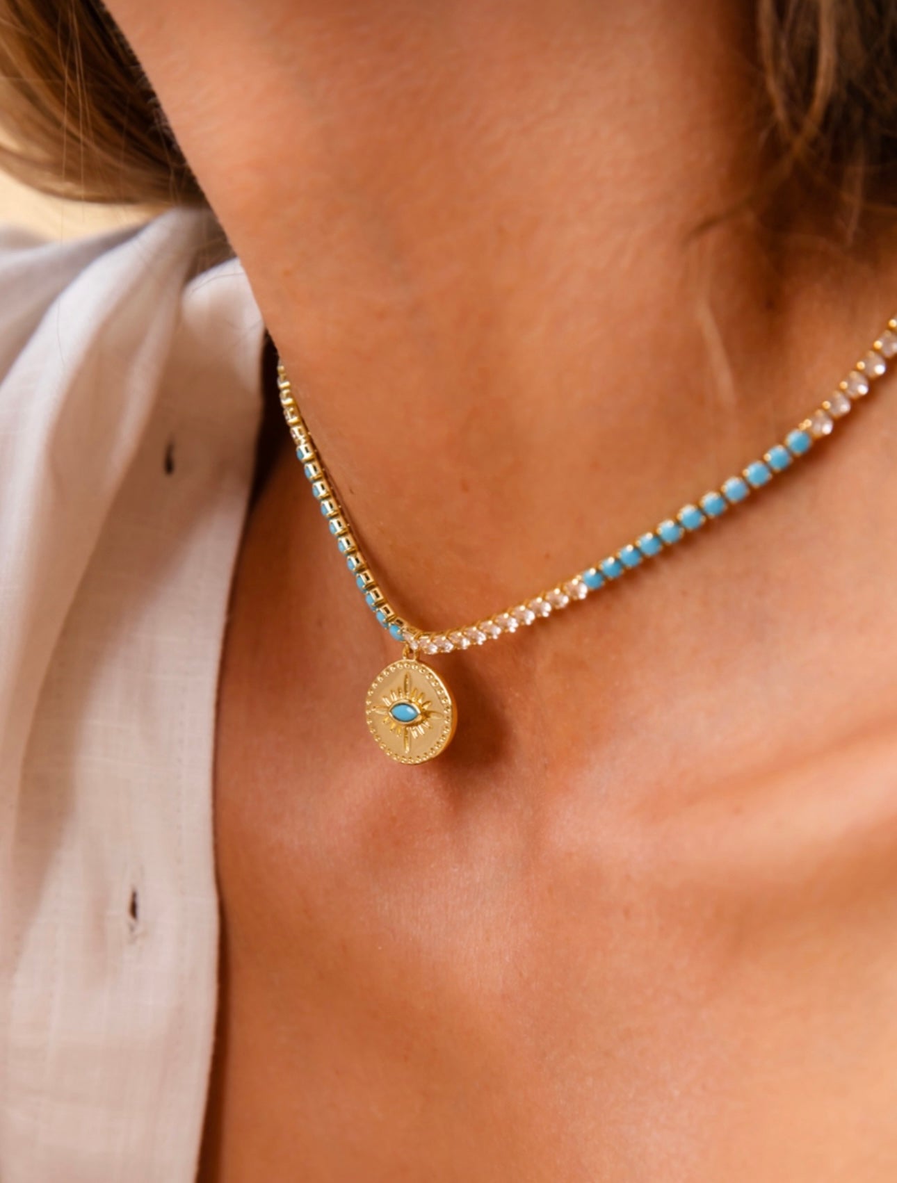 Turquoise Blue and Transparent Zirconia Tenis Crystals Necklace with Blue Eye Pendant